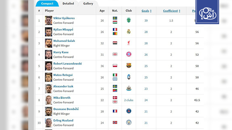 أما الصدارة، فما زالت في قبضة المهاجم السويدي غيوكيريس، لاعب سبورتينغ لشبونة، الذي أنهى موسمه في الدوري البرتغالي بـ39 هدفا، مانحا نفسه 58.5 نقطة وفق نظام احتساب الجائزة الذي يمنح 1.5 نقطة عن كل هدف في الدوريات المصنفة بين المركزين 6 و22 أوروبيا.