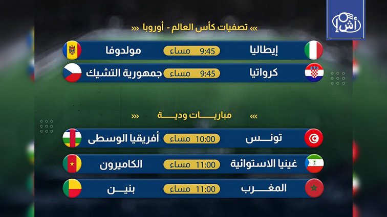 يستعد المنتخب الإيطالي لمواجهة مولدوفا في تصفيات كأس العالم 2026، بعد خسارته الأخيرة من النرويج، وتبث المباراة على beIN SPORTS 1، وفي مباريات ودية، يلتقي المغرب ببنين، وتلعب تونس ضد أفريقيا الوسطى.
