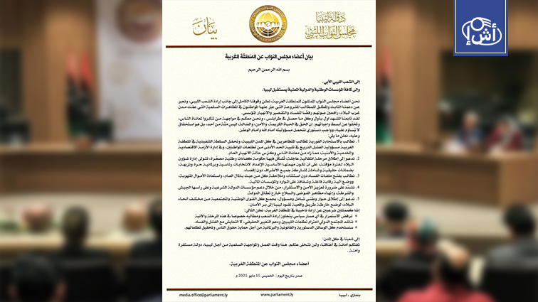 ودعا نواب المنطقة الغربية إلى إطلاق حوار وطني شامل يجمع القوى الوطنية من مختلف التوجهات والمناطق، على أن يتم ذلك تحت رعاية الأمم المتحدة، بما يضمن انتقالاً سلمياً نحو مرحلة سياسية مستقرة قائمة على التوافق الوطني.