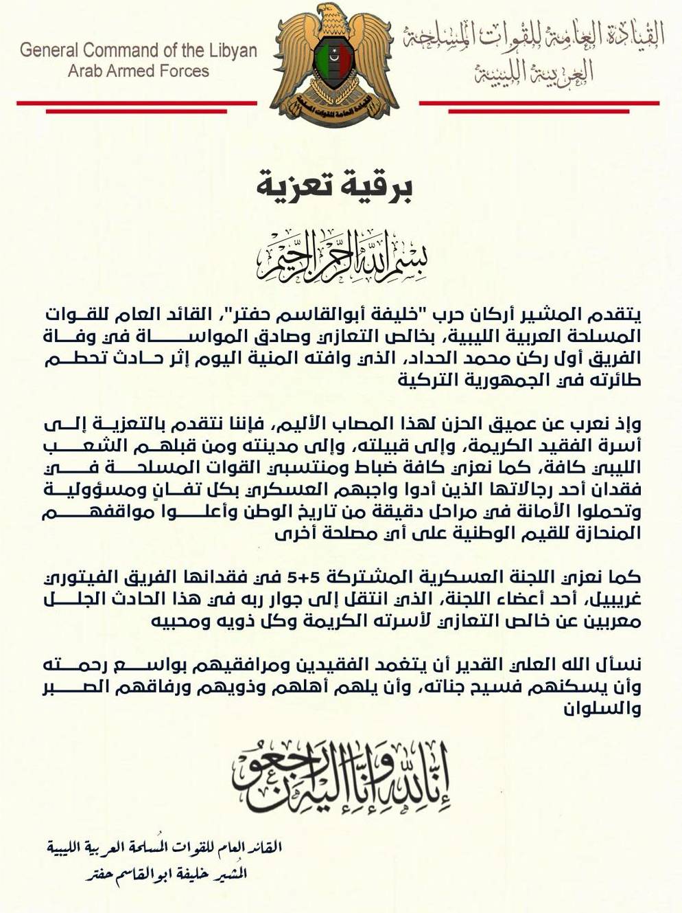 كما تقدم حفتر بالتعزية إلى اللجنة العسكرية المشتركة (5+ 5) في وفاة الفريق الفيتوري غريبيل، أحد أعضاء اللجنة، الذي لقي حتفه في الحادث ذاته.