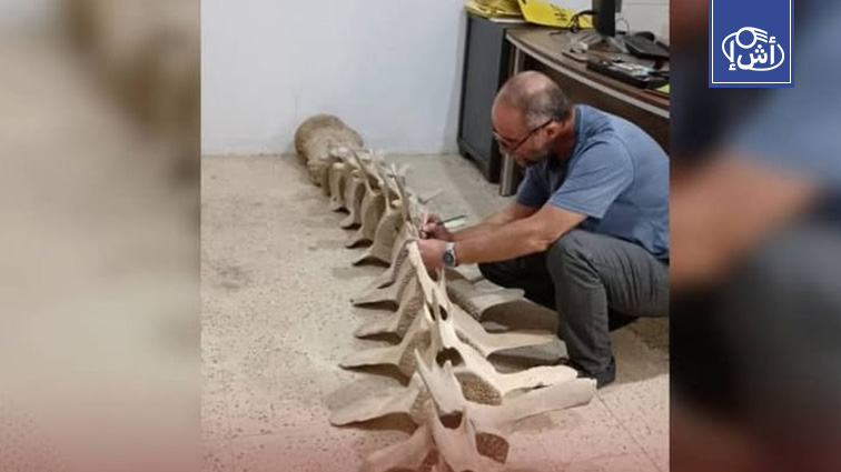 مراقبة آثار بنغازي تواصل أعمال تجهيز هيكل عظمي متحجر لحوت من فصيلة “ذوات البال”، تم اكتشافه سابقاً في منطقة قصر الصحابي في ليبيا.